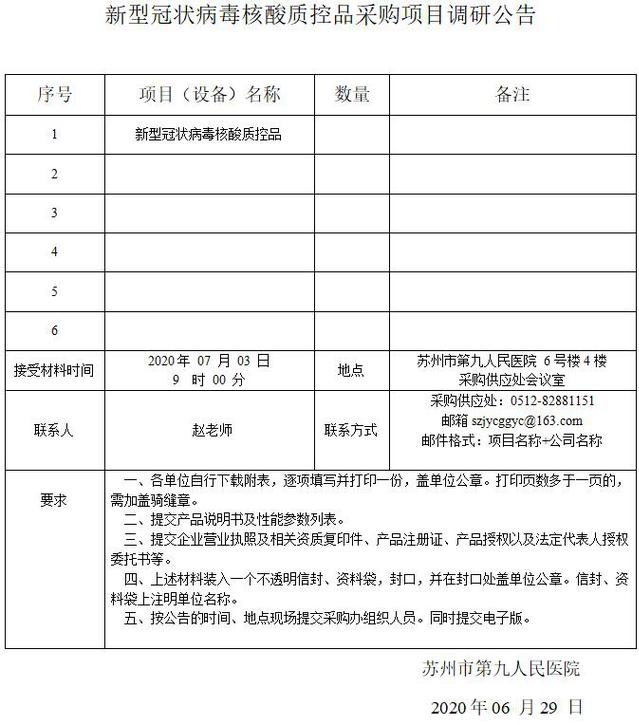 新型冠状病毒核酸质控品采购项目调研公告