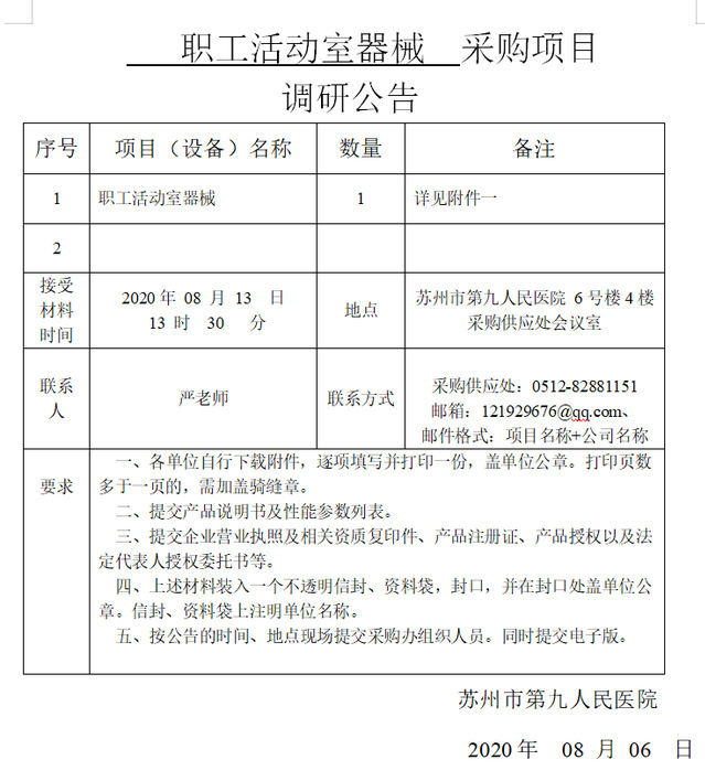 职工活动室器械采购项目调研公告