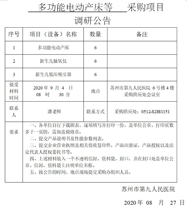 多功能电动产床等采购项目调研公告