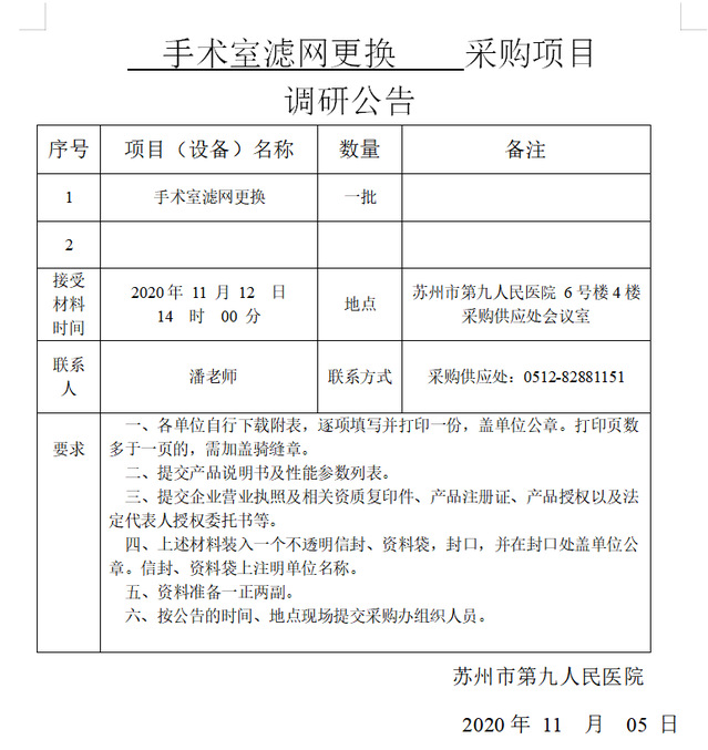手术室滤网更换采购项目调研公告