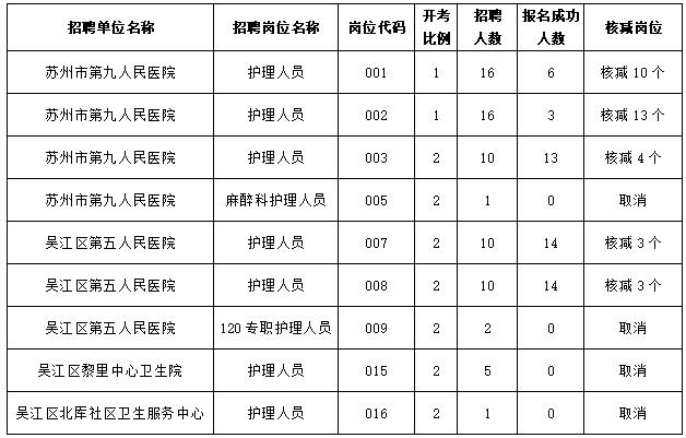 2020年苏州市吴江区北部健康医疗集团公开招聘合同制护理专业技术人员自2020年9月23日至2020年9月24日报名结束,共有9个岗位报名人数不足开考比例,根据规定,核减招聘计划,并公布如下: