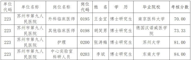 根据《2025年苏州市卫生健康系统长期公开招聘博士研究生专业技术人才公告》要求,对以下博士研究生考核成绩进行公示: