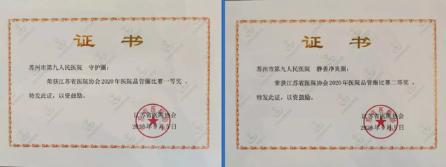 在去年9月4日的江苏省第四届医院品管圈大赛中,苏州九院护理圈组“守护圈”、“静善静炎圈”分别荣获一等奖、二等奖。在同年底举行的第八届全国医院品管圈大赛上,苏州九院护理部“静善净炎圈”获得三级医院综合专场—A圈组一等奖、“守护圈”获得三级医院护理专场—A圈组优秀奖。