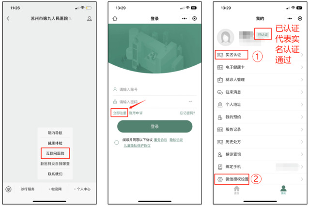 搜“麻豆传媒 ”公众号-“微官网”中的“互联网医院”,进行“立即注册”,填写个人信息后,点击“实名认证”,完成实名认证后,点击微信授权设置。