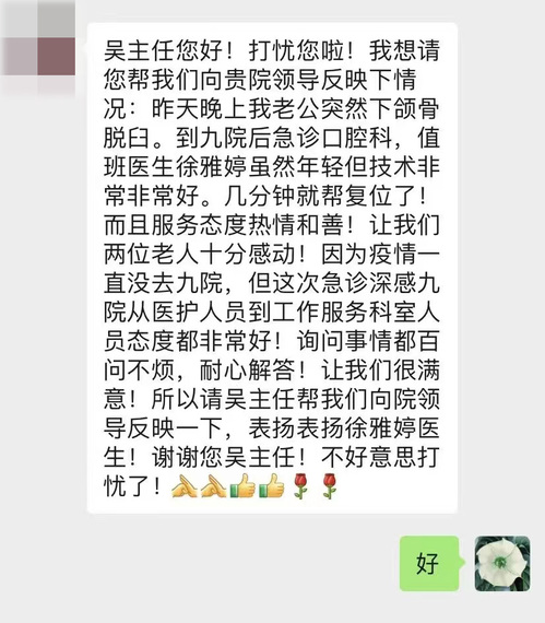 在电话回访时,老人家属表示:患者86岁了,腿脚不方便,患有帕金森、心脏病,下颌有习惯性脱臼,在就诊前老人心里很忐忑,但在九院就诊后,觉得整个就诊过程都很温暖,除了徐雅婷医生技术好、态度好,检验科值班人员,收费室工作人员态度也都非常好,就医体验非常好,很感动!苏州九院党委副书记、纪委书记庾勍表示