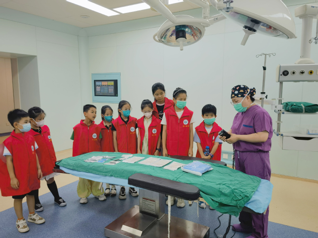 手术室很神秘。在护士长的耐心讲解下,孩子们不仅了解了手术室严格的无菌要求,亲身体验了手术前的清洁洗手过程,还有机会近距离观察手术灯光系统的操作、手术体位的调节,手术器械的巧妙运用以及医护之间的默契配合。这一切都让孩子们对父母的职业有了更加直观和深入的理解。