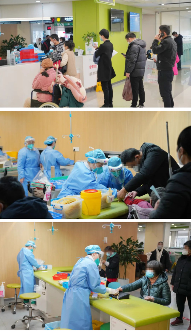 输液病人爆满,输液室染阳护士全部返岗,医院从其他科调配护士参与救治。