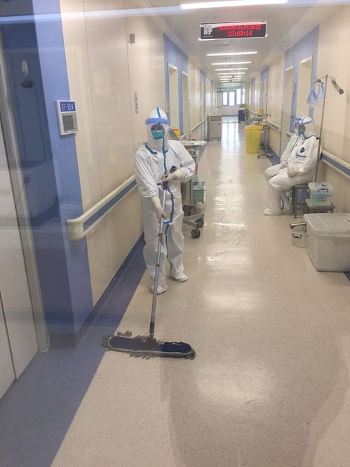 保洁组的尹建芬,娇小的身材却时常爆发出爽朗的笑声,自入职以来一直从事着院感大楼的保洁工作,她勤勤恳恳,兢兢业业,十年如一日,是患者眼中的热心阿姨,也是同事眼中的服务标兵,她曾抗击过2003年爆发的SARS,经历过2009年的H1N1流感,面对此次疫情,她依旧毫不退缩,舍弃小我,顾全大体,作为坤达公司应急小队成员,全心投入隔离病区24小时驻守清洁消杀工作,每天开始工作前,尹阿姨都要从头到脚武装的严严实实,这就是隔离病区一线人员的全部“装备”。